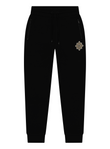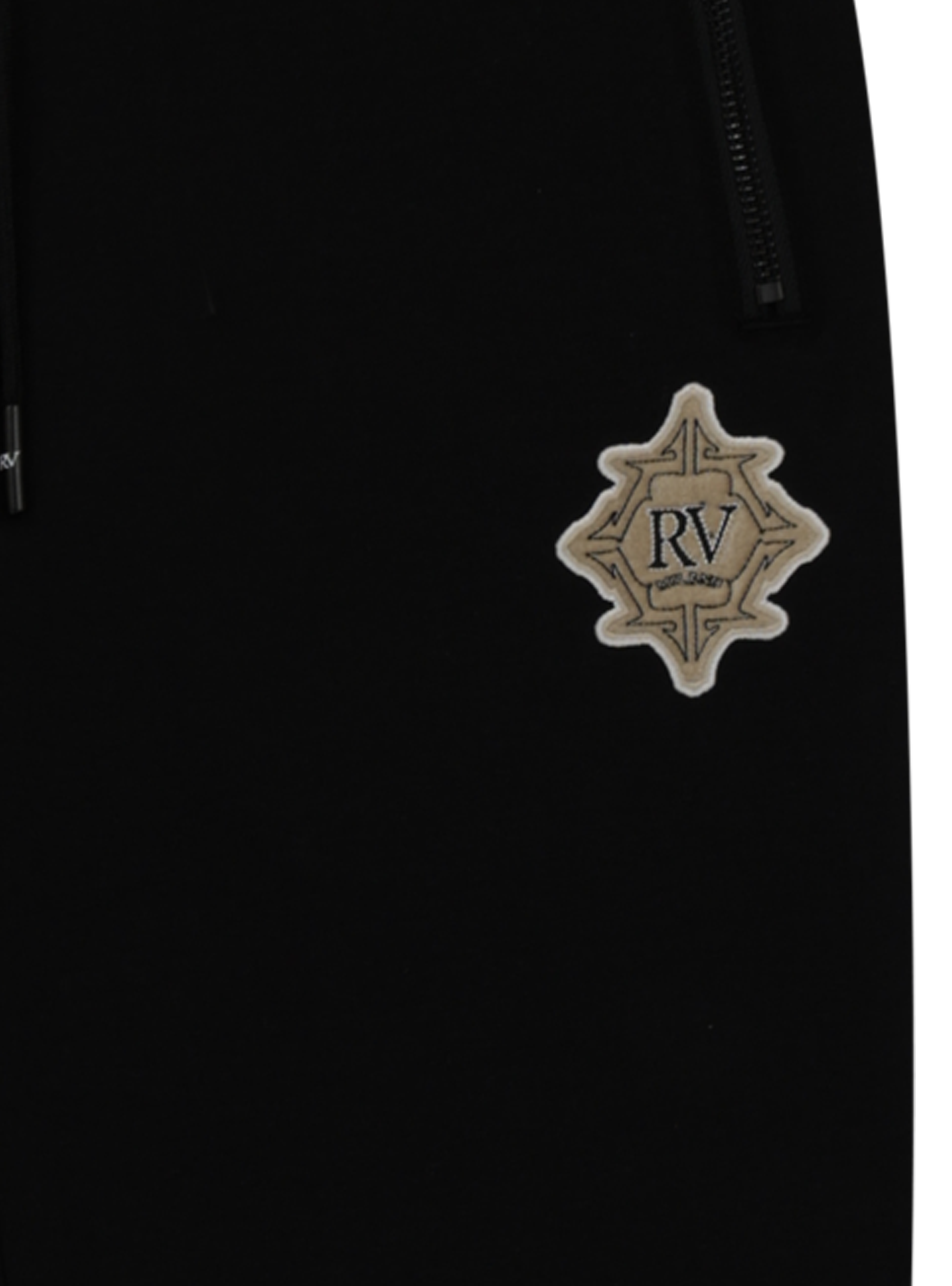 Sleek black jogger pants showcasing a detailed embroidered RV crest on the upper leg. Crafted for structure and style with zippered side pockets, ribbed ankle cuffs, and a drawstring waist for secure comfort.