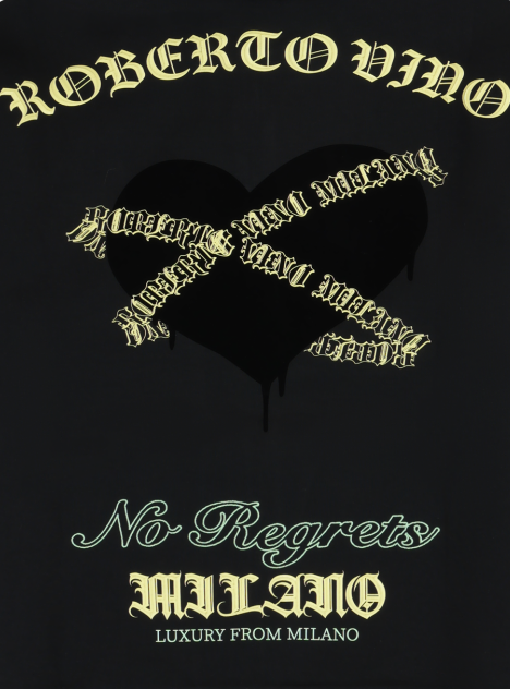 - Roberto Vino heart and ribbon graphic on front and back